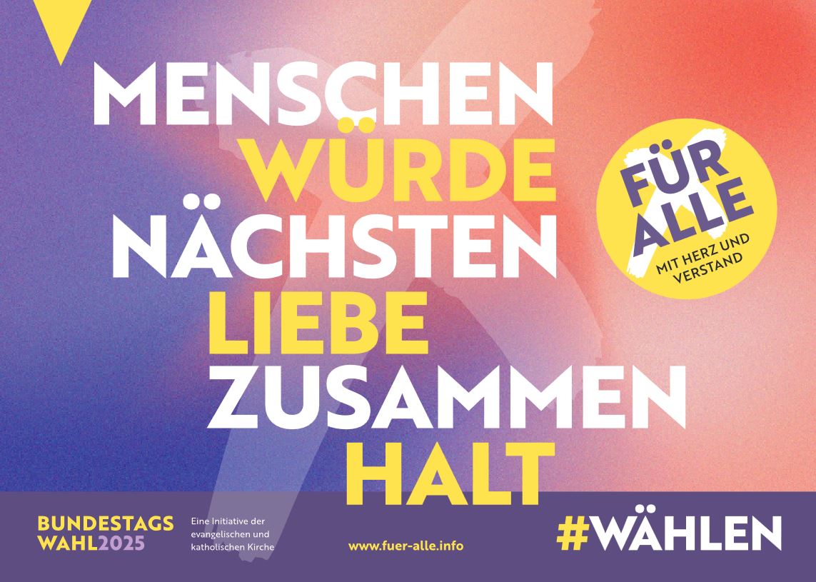 Das Bistum Würzburg beteiligt sich an einer bundesweiten ökumenischen Initiative zur vorgezogenen Bundestagswahl am 23. Februar 2025. In den Mittelpunkt rücken die christlichen Kirchen mit der Kampagne die Werte Menschenwürde, Nächstenliebe und Zusammenhalt. Unter dem Motto „Für alle. Mit Herz und Verstand“ rufen sie die Bevölkerung auf, durch aktive Teilnahme an den Wahlen die Demokratie zu stärken und extremistischen Positionen entgegenzuwirken.