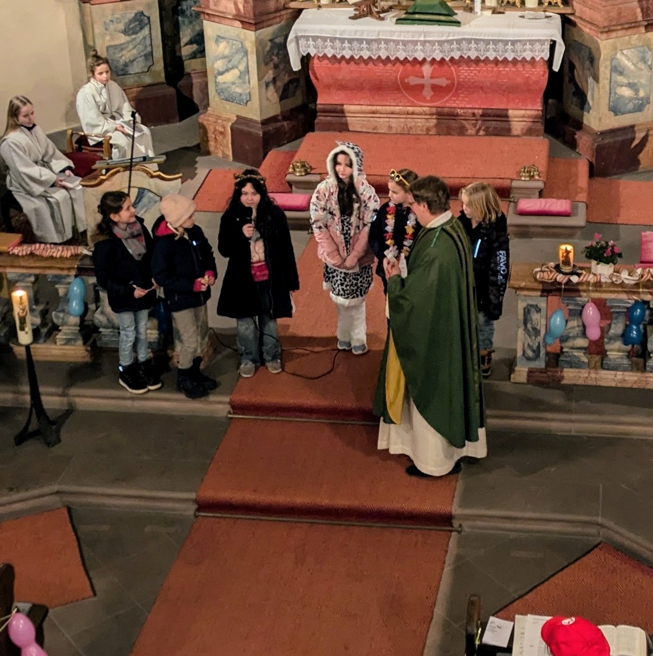 Die Kinder stellten sich mit Namen und Hobbys vor und wurden auch gleich in den Gottesdienst mit eingebunden. Sie trugen die Kyrie-Rufe vor, bei denen es um Luftschlangen, Luftballons und Verkleidung ging. Diese Begriffe standen symbolisch für „verwirrende Verbindungen“, „Verlässlichkeit“ und dass man mit einem Kostüm in die Rolle eines Anderen schlüpfen möchte. Bei den Fürbitten brachten sie die Freude, das Lachen und den Fasching mit ein. Zum „Vater unser“ versammelten sich die Kinder am Altar und den anschließenden Friedensgruß überbrachten sie persönlich zu den Leuten.