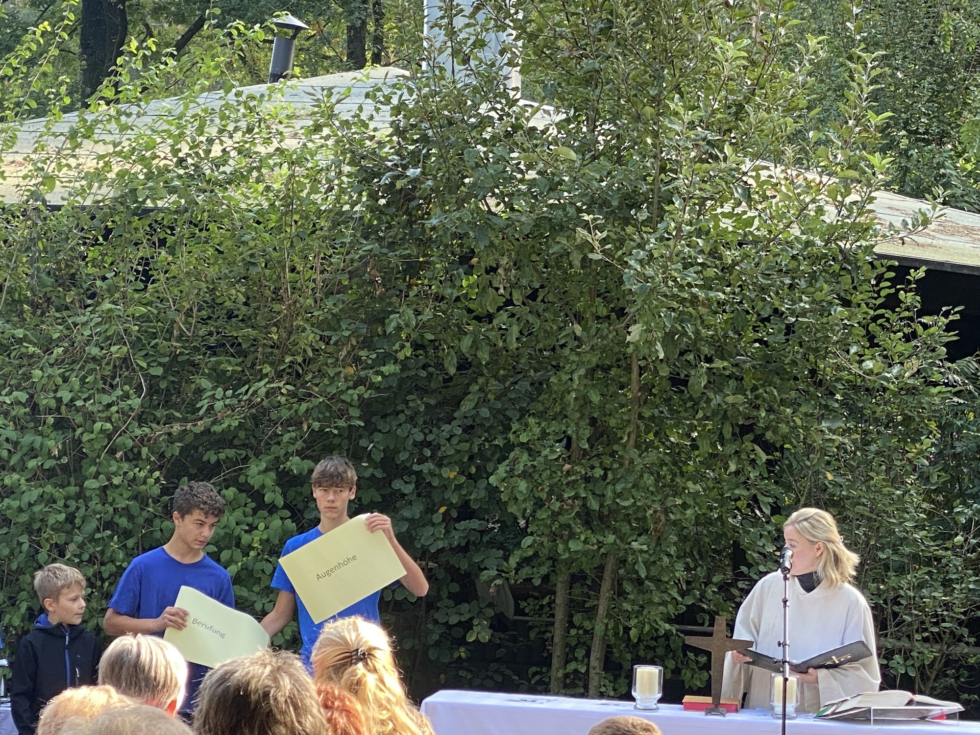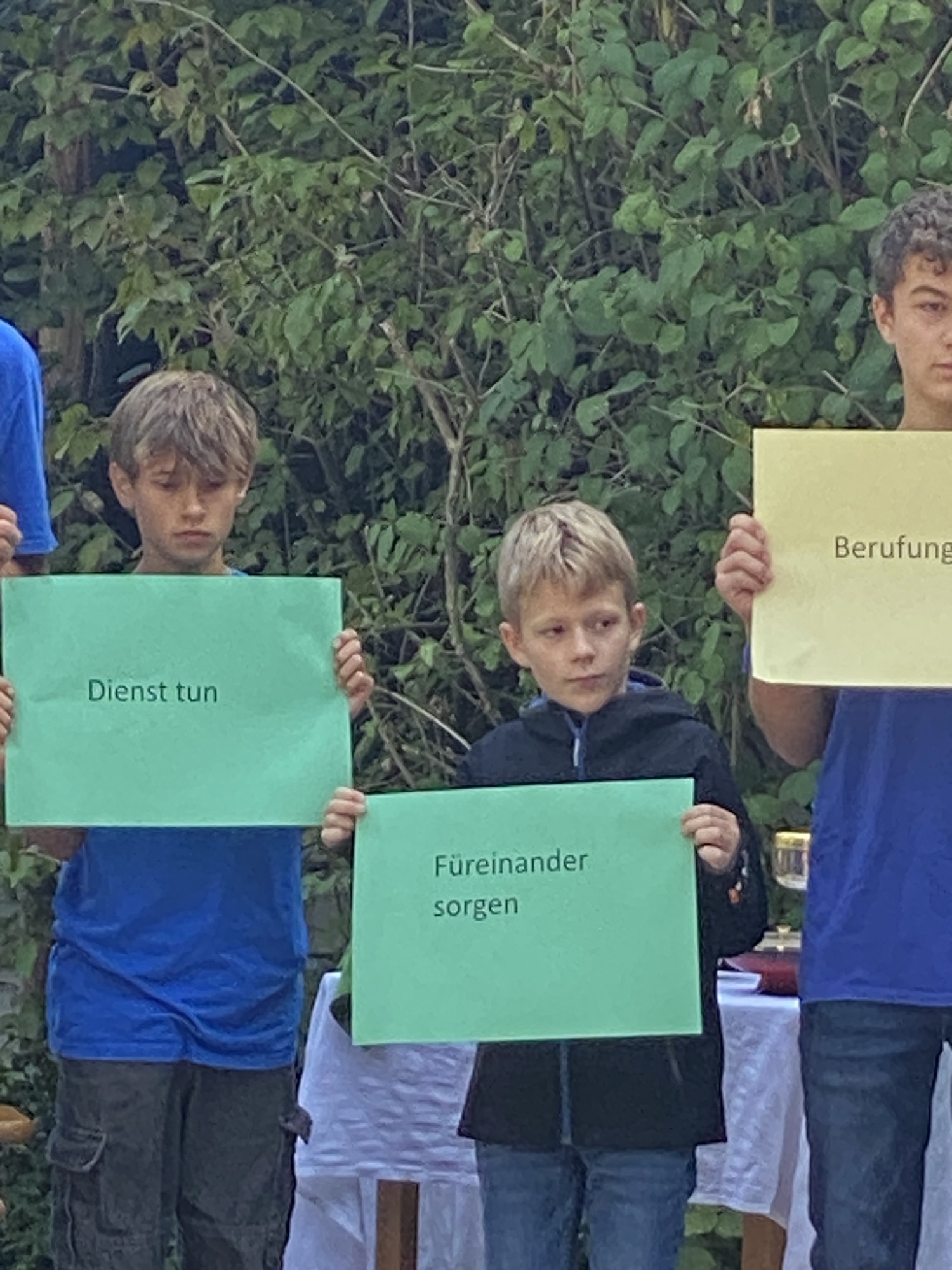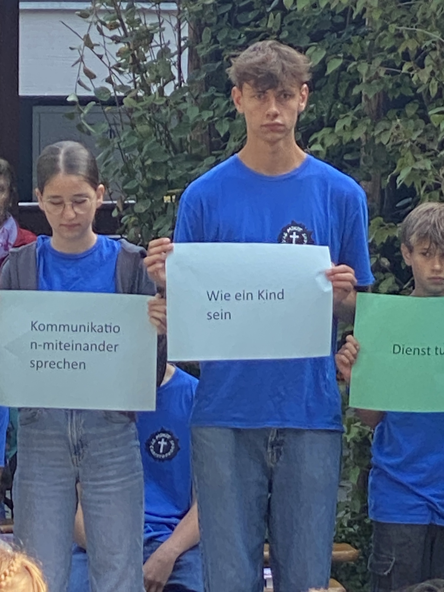 Das Evangelium „Wer von euch der Erste sein will, soll der Diener aller sein“ wurde pantomimisch eindrucksvoll von einer großen Ministrantengruppe dargestellt. Nicht der Größte ist der Wichtigste, sondern der Kleinste wurde als Vorbild in die Mitte gestellt. Die Vorbereitungsgruppe hatte zu diesem Evangelium Schlagworte erarbeitet und in Beziehung zum Umgang miteinander gesetzt. In kleinen wie in großen Gemeinschaften, so auch im Pastoralen Raum, sind Augenhöhe, Kommunikation, und Fürsorge wichtig. Man muss aufeinander achten und hinschauen, damit Gemeinschaft gelingen kann.