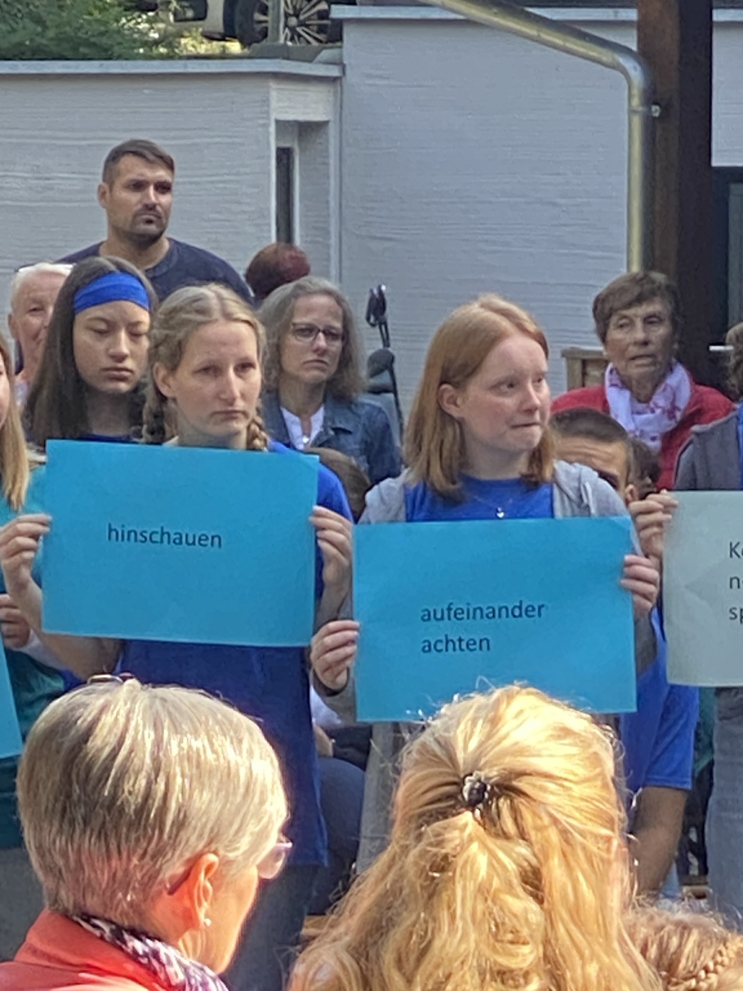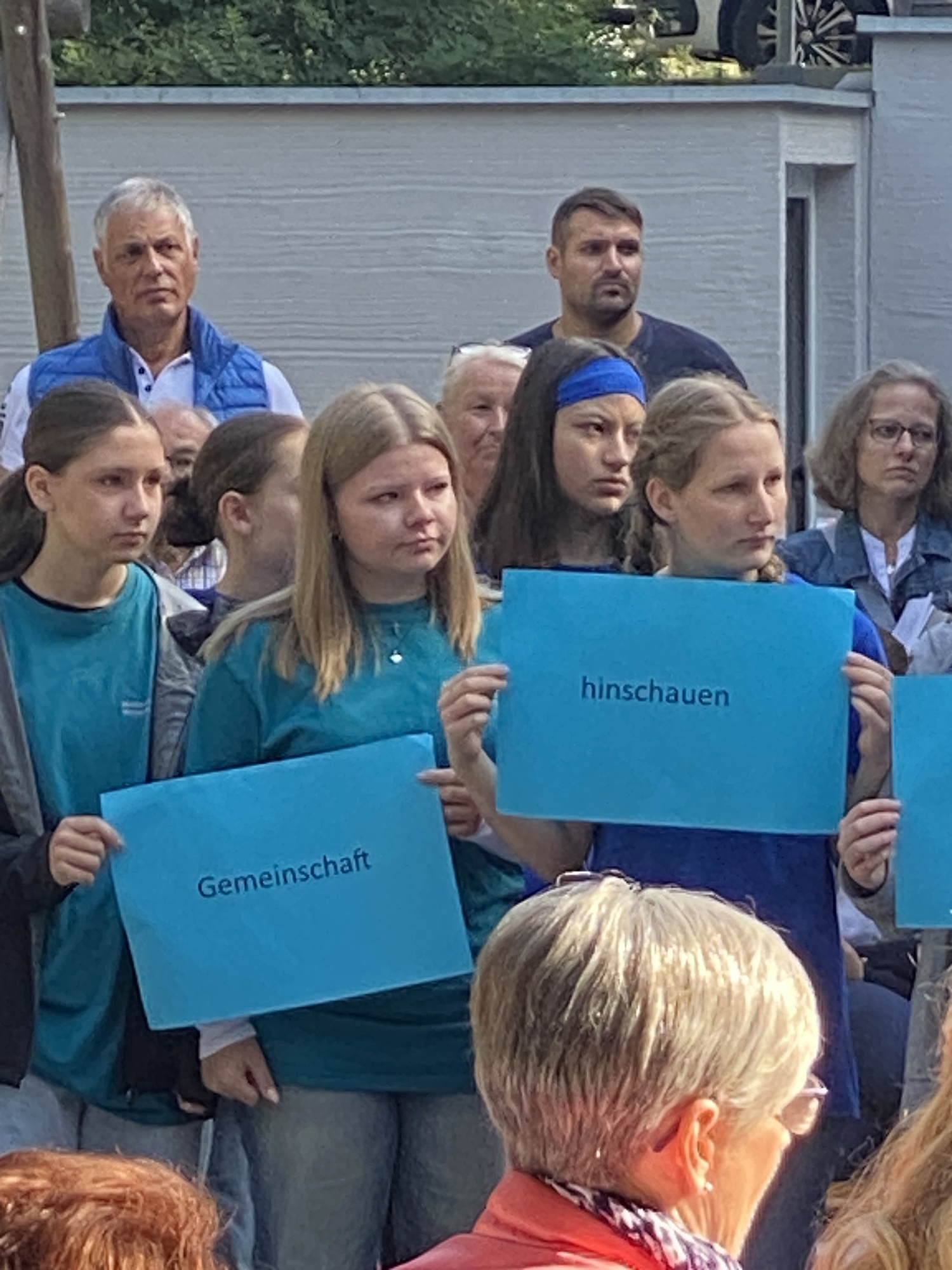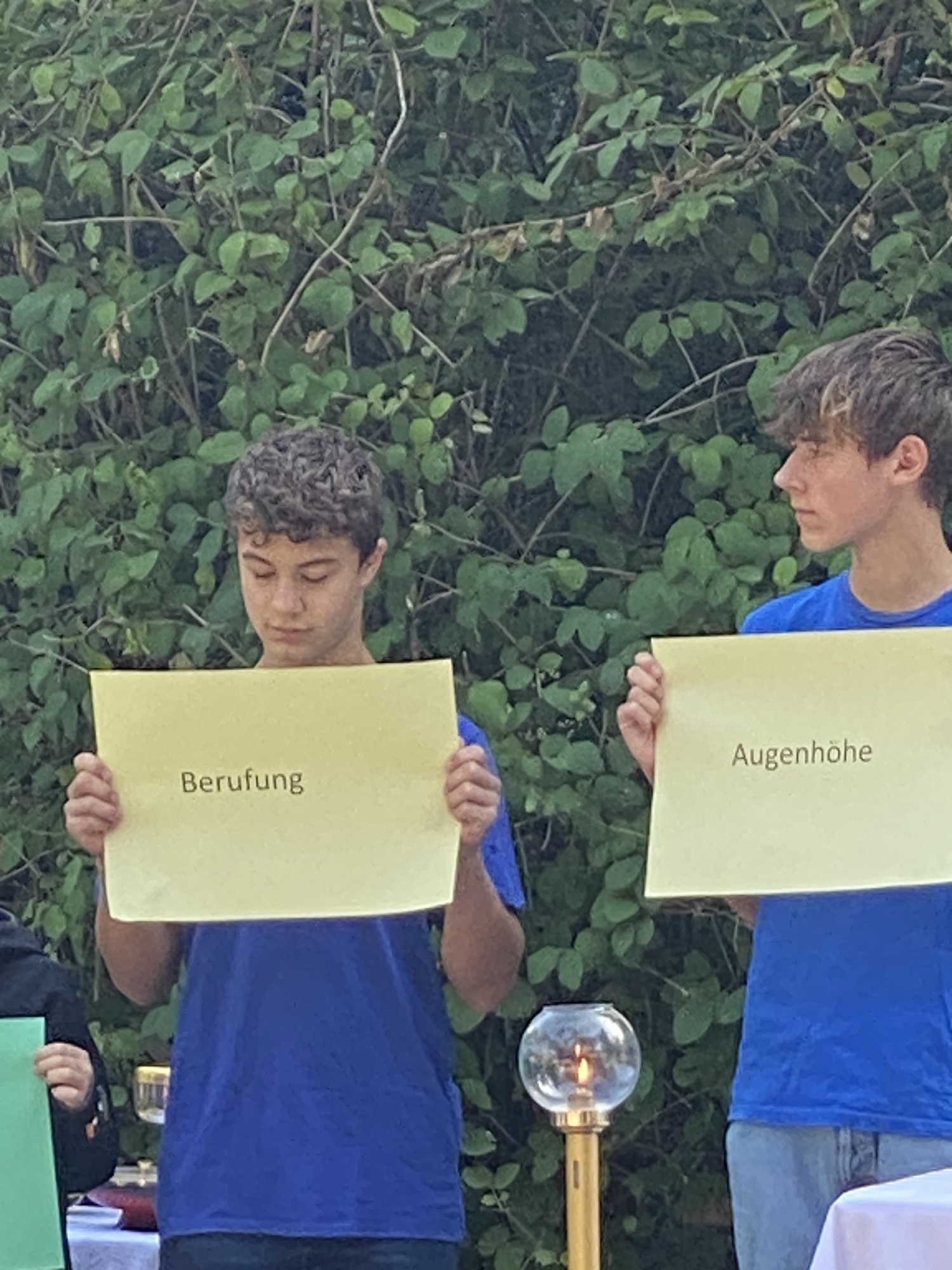 Das Evangelium „Wer von euch der Erste sein will, soll der Diener aller sein“ wurde pantomimisch eindrucksvoll von einer großen Ministrantengruppe dargestellt. Nicht der Größte ist der Wichtigste, sondern der Kleinste wurde als Vorbild in die Mitte gestellt. Die Vorbereitungsgruppe hatte zu diesem Evangelium Schlagworte erarbeitet und in Beziehung zum Umgang miteinander gesetzt. In kleinen wie in großen Gemeinschaften, so auch im Pastoralen Raum, sind Augenhöhe, Kommunikation, und Fürsorge wichtig. Man muss aufeinander achten und hinschauen, damit Gemeinschaft gelingen kann.