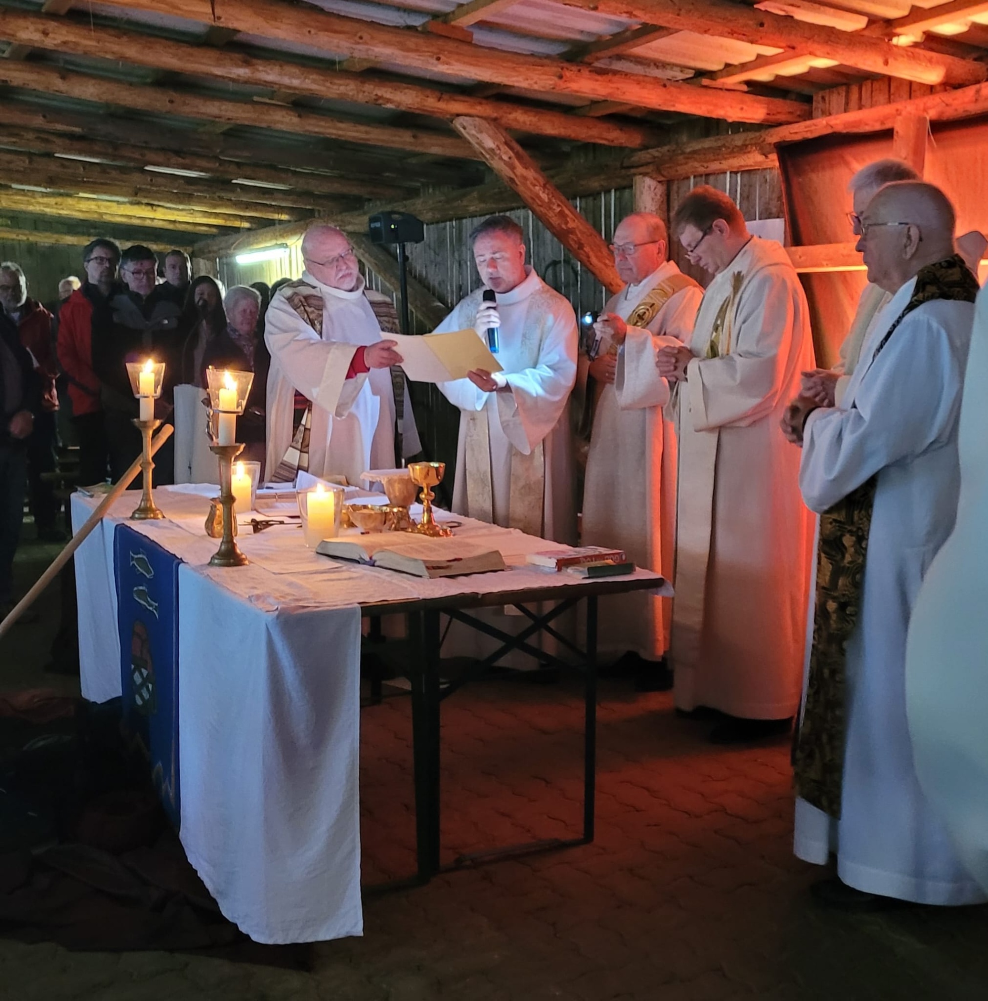 Punktgenau zum Ende des Gottesdienstes hatte der Regen aufgehört, sodass viele Besucher wie in den Jahren zuvor die Gelegenheiten nutzten, bei Getränken und Kleingebäck miteinander ins Gespräch zu kommen. Und so hatte man an diesem Vormittag die Erfahrung gemacht, dass auch bei widrigen Umständen positive Eindrücke bleiben: man war unter dem Hallendach zusammengerückt, hatte dem leisen Trommeln des Regens auf dem Dach lauschen können - ein Gottesdienst fast mit Lagerromantik.