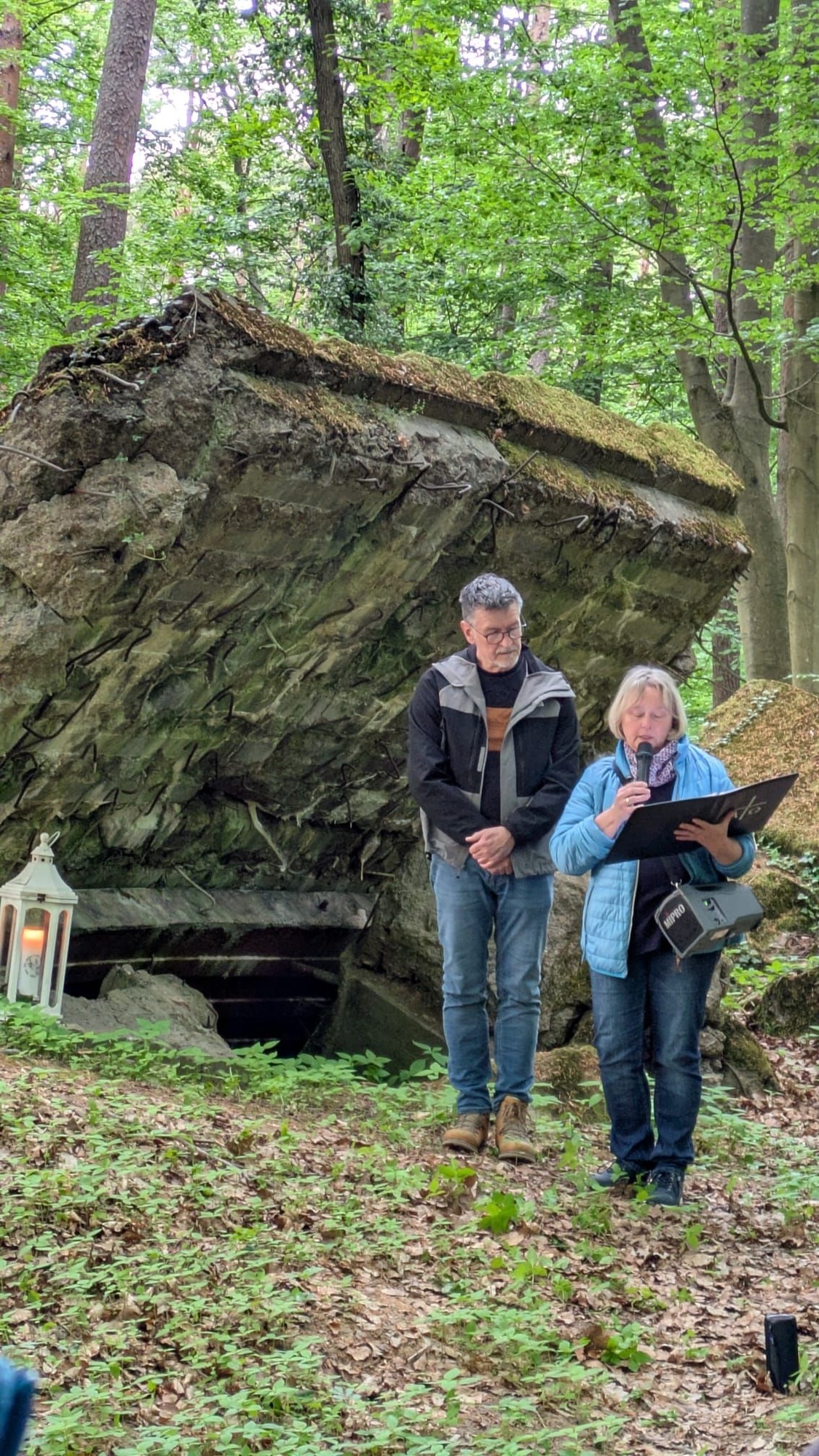 Am Bunker angekommen baten die Teilnehmenden in ihren Fürbitten um Frieden, Gerechtigkeit, Sicherheit und Verständnis untereinander. Sie beteten für alle Opfer, aber auch für die Täter und darum dass wir niemals vergessen, zu welchen Grausamkeiten Menschen in der Lage sind und wie sinnlos Krieg ist. Gemeinsam sprachen wir das „Vater unser“ und, an Maria, die Mutter, Fürsprecherin und Botin des Friedens ist, gewandt, das „Gegrüßet seist du Maria“.