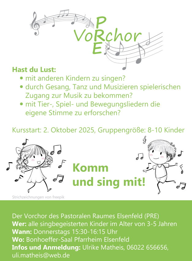 Im kommenden Schuljahr wächst der Kinderchor PRO (Pastoraler Raum Obernburg) über die Maingrenze und wird ergänzt durch den Vorchor PRE (Pastoraler Raum Elsenfeld). Der Vorchor bereitet die Kinder in der vokalen Früherziehung auf das Singen im Kinderchor vor.
