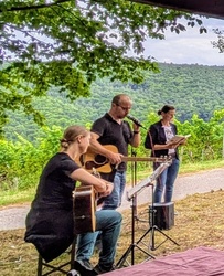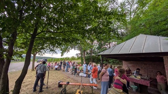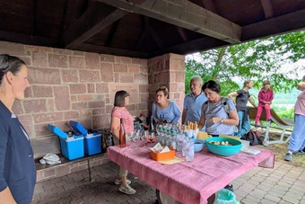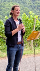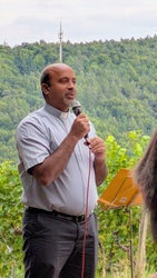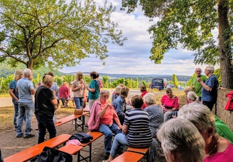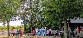 Bei schönem Wetter fand in ungewohnter Umgebung am Weinbergspavillon in Rück eine besondere Andacht statt. Gemeindeassistentin Verena Deuchert betonte, dass hier ein schönes Fleckchen von Gott geschaffen wurde und, wie im Lied besungen, Gott unsere „Füße [hier] auf weiten Raum“ stellte. Im Weinberg treffen sich auf ganz besonderer Weise Gottes Schöpfung und menschlicher Kultivierung dieses Gottes Geschenkes. Mit harter Arbeit, Pflege, Fleiß, Können und Hoffnung wird ein guter Tropfen Wein geschaffen. Auch der Bibeltext aus dem Buch Kohelet (Prediger) machte nochmal darauf aufmerksam, dass Gottes Geschenke mit Freude und Genuss anzunehmen seien: „Genieße den Tag mit den Menschen die du liebst, solange du lebst.“ (Kohelet 9, 9)