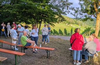 Den Abschiedssegen erhielten wir von Pater Richard, der die Gedanken der Auszeit nochmal mit der Tageslesung verband. Mit diesen Impulsen im Kopf stimmten wir in das Abschlusslied: „Froh sein lässt meine Seele den Herrn“ ein. Und gingen dann, ganz im Sinne des Bibeltextes, zum gemütlichen Teil über. So fand der Abend seinen Ausklang bei einem guten Schoppen Wein - vielen Dank an Simone Weinfurter - und geselligem Miteinander. Wir freuen uns aufs nächste Jahr und die nächste „Auszeit im Weinberg“ und laden alle schon mal herzliche dazu ein.