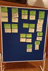 Nach einer kurzen Pause wurden den Tischgruppen Aufgaben gestellt: „Welche Chancen nehmen wir als Kirche in unserem Pastoralen Raum wahr?“ und „Wie sieht unser nächster Schritt aus, diese Chancen anzupacken?“ Auf zwei verschiedenfarbigen Zetteln sollten entsprechende Lösungen für die beiden Fragen gefunden und anschließend präsentiert werden. Das Ergebnis konnte sich sehen lassen: auf einer Tafel waren schließlich 32 Zettel zu finden, welche für die Mitglieder im gemeinsamen Rat des Pastoralen Raums eine Handlungsbasis bilden könnten.