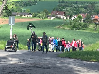 Beschwingt ging unser Weg bergan mit dem Wallfahrer-Lied „Beim frühen Morgenlicht“. Die rund 15 km lange Strecke wurden sehr abwechslungsreich zurückgelegt. Auf unserem ersten Wegstück durch den Wald umrundeten wir ein kleines Hindernis: ein vom Gewitter umgestürzter Baum lag auf dem Wanderweg Richtung Streit. Dies hat uns jedoch nicht aufgehalten und auf unserem weiteren Weg erfuhren wir die Wallfahrt wieder als ein besonderes Erlebnis.