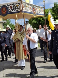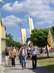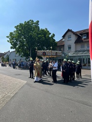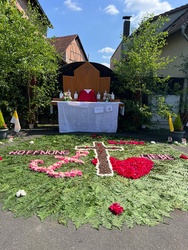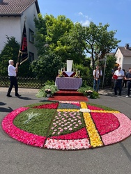Bei herrlichem Sommerwetter konnte in Elsenfeld nach dem Festgottesdienst in der Christkönigskirche die traditionelle Fronleichnamsprozession stattfinden. Der Prozessionsweg war von den Anwohnern mit christlichen Motiven geschmückt und an den beiden ersten Altären waren farbenprächtige Blumenteppiche ausgelegt.