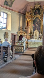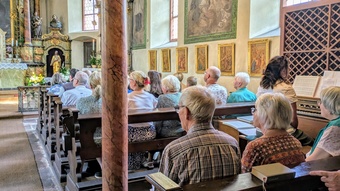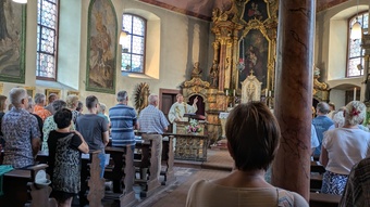 Bei uns wird er viel angerufen um verlorene Dinge wiederzufinden. Pfarrer Skolucki meinte, dass bei dem Bau der Kirche unsere Vorfahren ihr Herz geöffnet haben um Gottes Gegenwart erfahrbar zu machen. Dann schlug er den Bogen zu Barbara Weigand, die ja auch ein lebendiges Glaubensbekenntnis ablegte. Er legte uns nahe, dass auch wir uns für Gottes Wort öffnen sollen und beim Lesen der Bibel dieses auch fühlen sollen. Nach dem feierlichen Schlusssegen und dem Lied „Großer Gott wir loben Dich“ trafen wir uns neben der Kirche zu einem Gläschen Sekt und ließen bei anregenden Gesprächen und einem schönen Miteinander den Abend ausklingen. Vielen Dank auch an die Organistin Christina Breunig aus Mönchberg.