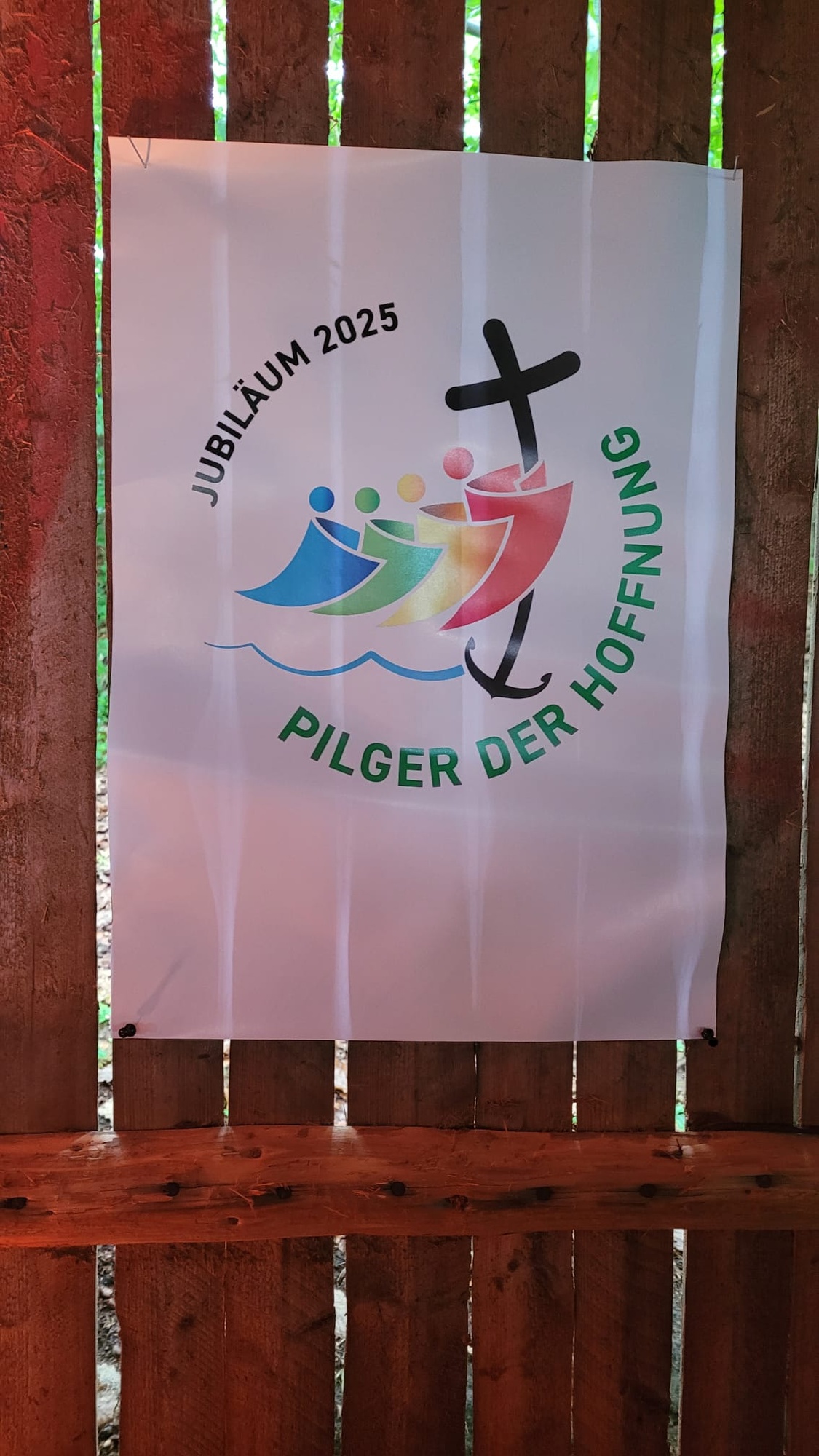 In das Thema „Pilger der Hoffnung“ führte das Gottesdienstteam mit der Erläuterung des Logos zum Heiligen Jahr ein: vier farbige Figuren, die symbolisch für die Vielfalt der Menschen in den Ländern unserer Welt, aber auch in unseren Gemeinschaften vor Ort stehen, umfangen sich gegenseitig. Sie betonen Geschwisterlichkeit und Solidariät. Die vordere Figur umfängt das Kreuz, das sich den Figuren zuneigt und sich nach unten in einen Anker verlängert - ein Zeichen, dass der Glaube in den Stürmen unseres Lebens ein Hoffnungsanker ist.