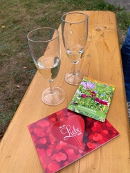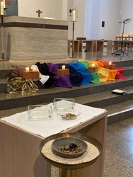 Rot z.B. ist die Farbe der Liebe, der Leidenschaft - zu unserem Partner, unserer Partnerin, aber auch zu Gott. Die Paare wurden eingeladen, sich gegenseitig wertschätzende und anerkennende Wort zu sagen. Grün steht für Wachstum - an dieser Stelle durften sich die Paare Samentütchen als Erinnerung mitnehmen, um zu Hause den Samen einpflanzen zu können. Bei der Farbe Dunkelblau wurden Glasschälchen mit Weihwasser herum gereicht, damit sich die Paare gegenseitig segnen konnten und als ein violettes Tuch auf die Stufen gelegt wurde, durften alle Anwesenden Weihrauch ins Weihrauchfass legen, um alle Bitten und Gebete mit dem Rauch aufsteigen zu lassen zu Gott. Als die Fürbitten gesprochen waren, segneten Pfarrer Lang und GemRef Kloos die feiernde Gemeinde. Ein mehr als berührender Gottesdienst klingt sicher in allen, die ihn erleben durften noch lange nach. Anschließend lud das Gemeindeteam von Elsenfeld zu einem kleinen Umtrunk auf dem Vorplatz der Kirche ein. Dieser Einladung folgten die Paare gerne und stießen bei einem Glas Sekt auf weitere gemeinsame Jahre an.
