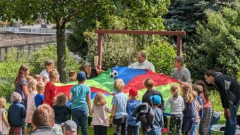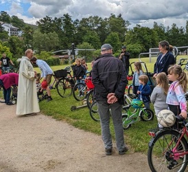 Mit dem Beginn der Fußball Europameisterschaft in Deutschland rollt wieder der Ball. Viele sind mit dem Rad oder dem Roller zum Gottesdienst gekommen und her gerollt. Und an Ostern da kam mit dem weggerollten Stein wirklich etwas ins Rollen. Die Botschaft von der Auferstehung verbreitete sich über die ganze Welt und seit dieser Zeit treffen sich Christen am Sonntag, um aus dieser Hoffnung heraus zu leben und Mut und Kraft für ihr Leben zu finden. Mit einem Fallschirm konnten die Kinder spielerisch den Ball ins Rollen bringen. Nach den Fürbitten folgte, wie zur Zeit der frühen Christen, eine Agapefeier. Die Kinder verteilten das gesegnete Brot, bevor am Ende alles was rollt - Fahrräder, Fußbälle, Roller, Kinderwägen - und deren Besitzer gesegnet wurden. Es war ein toller Gottesdienst an einem ungewöhnlichen Ort. Bringen wir als Christen heute in unserer Gesellschaft, in unseren Familien und Schulklassen, etwas ins Rollen.