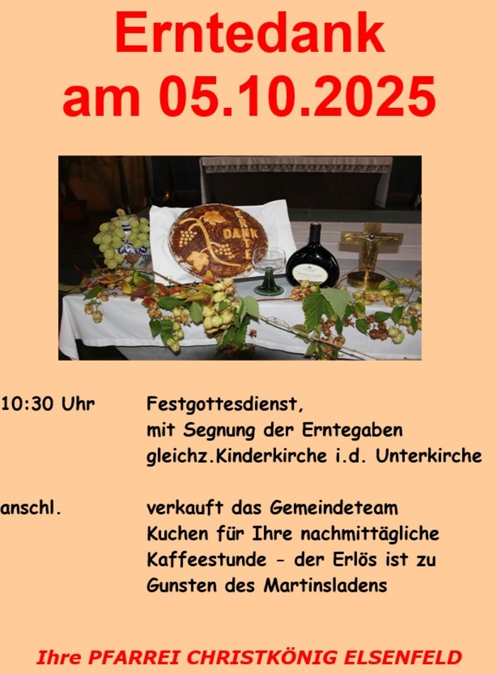 Erntedankgottesdienst mit Kinderkirche, anschliessend Kuchenverkauf zugunsten des Martinsladens