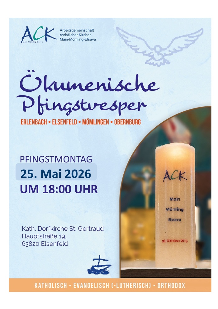 Die Arbeitsgemeinschaft christlicher Kirchen (ACK) lädt herzlich ein zur Pfingstvesper in die alte Dorfkirche St.Gertraud in Elsenfeld.