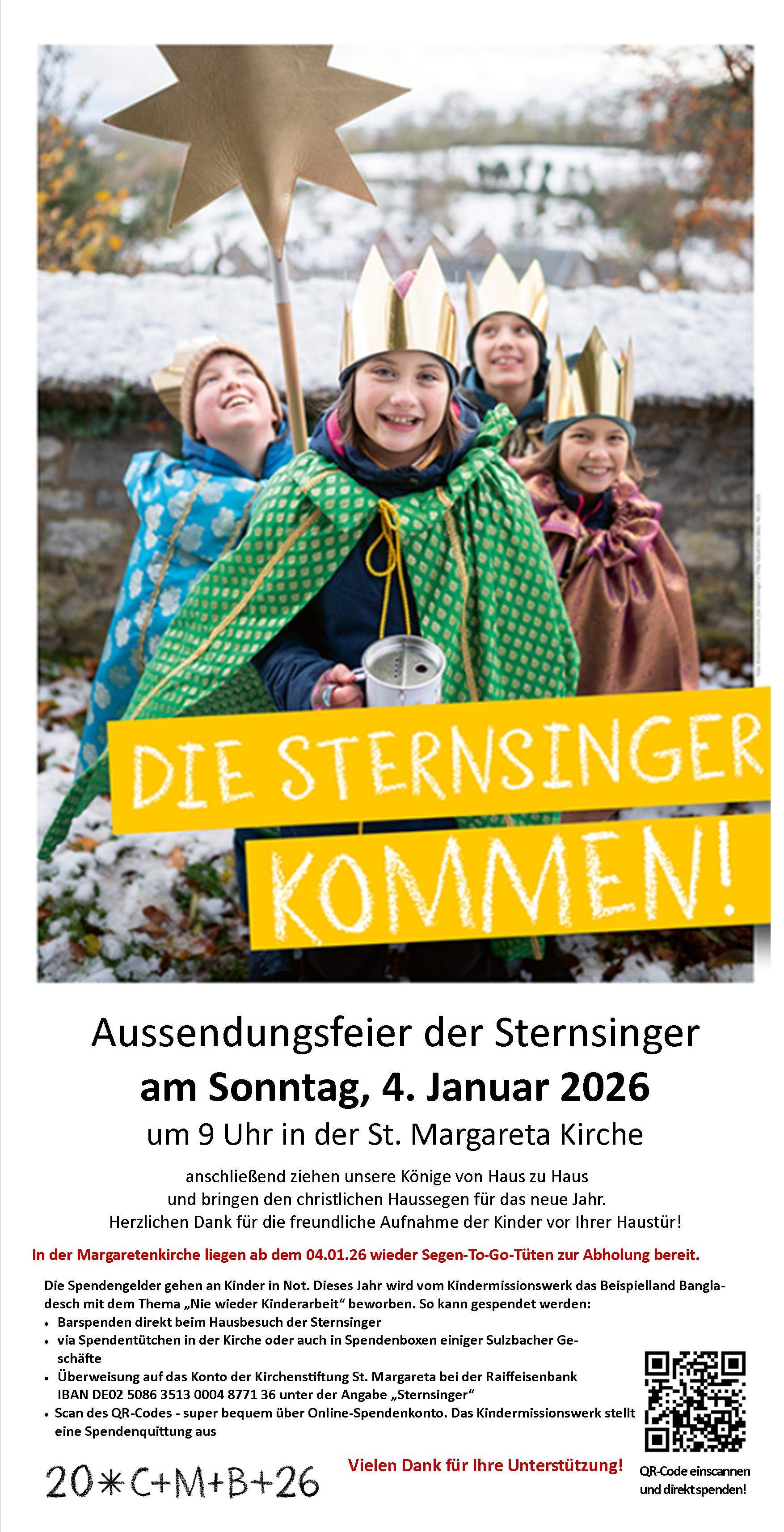 - Überweisung auf das Konto der Kirchenstiftung St. Margareta bei der Raiffeisenbank IBAN DE02 5086 3513 0004 8771 36 unter der Angabe „Sternsinger“