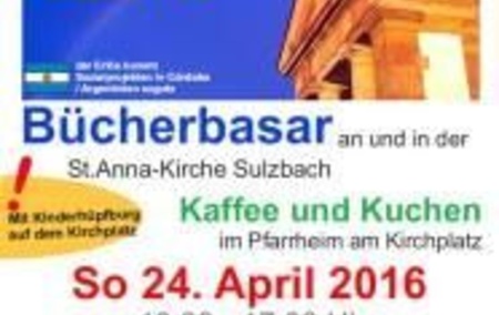 findet jeweils Frühjahr und Herbst um oder in der Annakirche statt. Zusammen mit dem Team des Sulzbacher Weltladens laden wir zum Stöbern und Schmökern in unserem breit gefächerten Bücherbestand ein. Gleich nebenan im Pfarrheim erwartet die Besucher eine reichhaltige Auswahl an selbstgebackenen Kuchen. Der Erlös kommt Sozialprojekten der Obispo-Angelelli-Stiftung im argentinischen Córdoba zugute.