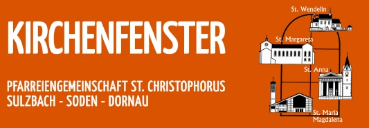 Die katholische Pfarreiengemeinschaft St. Christophorus Sulzbach gibt im Jahr normalerweise drei Ausgaben des Pfarrbriefes „Kirchenfenster" heraus: Zu Ostern, im Juli und zu Weihnachten. Bei Bedarf erschienen in der Vergangenheit auch schon zusätzliche Sonderausgaben im Oktober. Das „Kirchenfenster" wird an alle katholischen Haushalte der Gemeinde kostenlos von ehrenamtlichen Austrägern verteilt. Dafür an dieser Stelle ein herzliches Vergelt's Gott. Zusätzliche Exemplare liegen für alle Interessierten in unseren Kirchen an den Zeitschriftenständen aus.